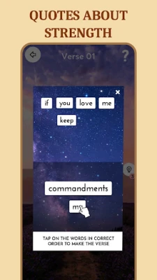 Selami cabaran teka-teki yang pelbagai, bermula dengan menyambungkan huruf-huruf untuk membentuk ayat-ayat Alkitab yang lengkap dan menyentuh jiwa. Uji pengetahuan anda melalui silang kata Alkitab yang mendalam dan tajam, atau latih ketajaman mata anda dalam mencari perkataan tersembunyi dalam grid carian perkataan Alkitab. Setiap sesi adalah peluang untuk menemui pelajaran hidup daripada Alkitab Suci, diperkayakan dengan petikan bermakna dan imej visual yang menawan. Nikmati ayat-ayat harian yang menyentuh tema universal seperti Kehidupan, Harapan, Kasih Sayang, Kekuatan, Kemaafan, Bantuan, Dorongan, dan Iman, memberikan anda suntikan positif setiap kali anda bermain.