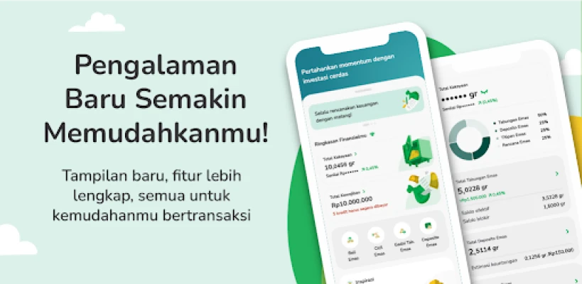 Lebih dari sekadar penyelesaian dana segera, Tring! juga membuka pintu pelaburan emas untuk semua. Mulakan perjalanan investasi anda dengan Cicil Emas Batangan 24K, di mana anda boleh memilih denominasi serendah 0.5 gram sehingga 25 gram dengan wang muka hanya 15% dan tenor ansuran sehingga 36 bulan. Atau manfaatkan Tabungan Emas yang menawarkan kemudahan membeli, menjual, memindahkan, dan mencetak emas secara praktikal. Dengan modal serendah Rp10.000, anda boleh membina simpanan masa depan, malah menggunakan emas tabungan anda sebagai cagaran melalui Gadai Tabungan Emas untuk keperluan mendesak, dengan sewa modal hanya 0.75% per 15 hari.